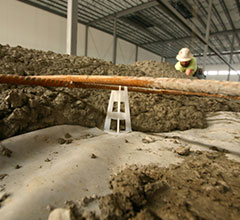 “The mud slab encases the glycol system that keeps the floor from heaving in response to freezing temperatures,” Gorogianis notes. “This section measured 180 feet by 140 feet, with a single joint running across the shallow side at 120 feet.”