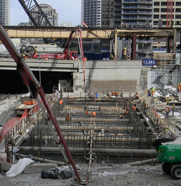 “No question – it was incredibly cold out there!” he says. “But since we were working with SCC, we had a much smaller crew. Our two pumps remained stationary, and without the need to vibrate the mix, the carpenters, ironworkers and laborers working down in the hole were kept to a minimum.”